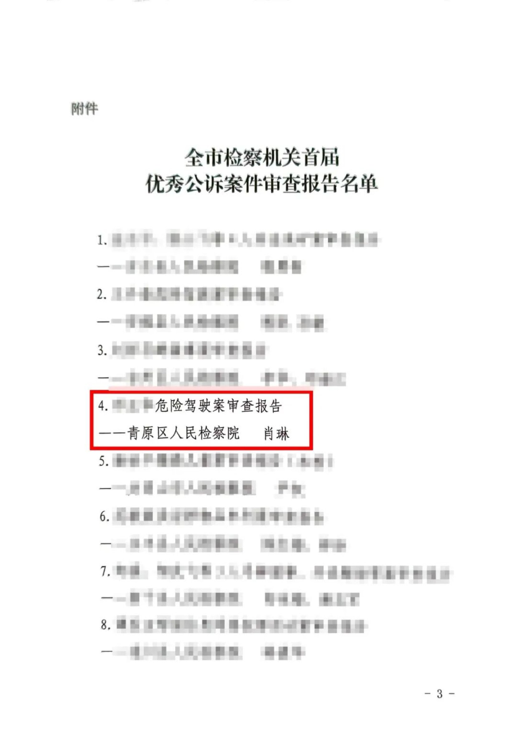 近日,吉安市人民检察院下发《关于全市检察机关首届优秀公诉案件审查报告评选结果的通报》,青原区人民检察院第一检察部肖琳检察官撰写的一起危险驾驶案审查报告获评全市检察机关首届优秀公诉案件审查报告。